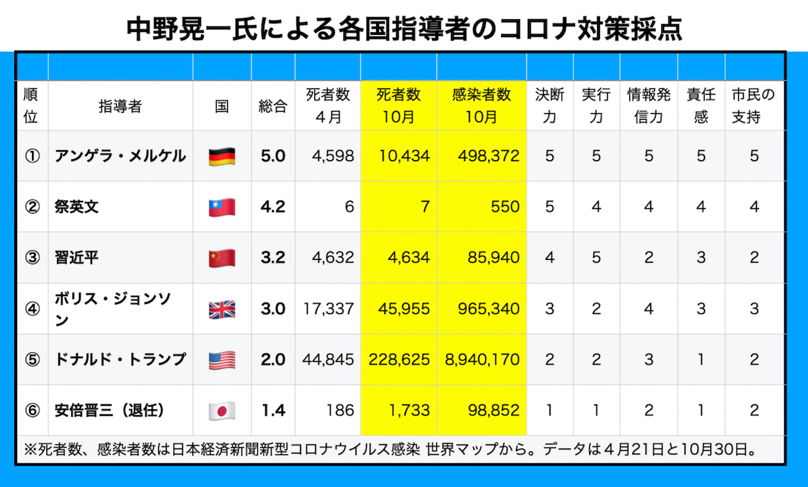 そのような目で、あらためて表を見ていただきたい。死者数が最も少なく、200日以上国内感染者がゼロの台湾の蔡英文総統がコロナ対策に最も成功した指導者であるのは疑いがない。それが封じ込めに失敗して都市再封鎖に追い込まれたメルケル首相が全項目5点満点である。
