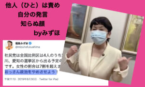 「社民党は全国比例区は4人のうち3人が女性、東京、神奈川、愛知の選挙区から出る予定の人は3人のうち2人が女性です。女性の割合は7割を超えました。女性が未来を開く。おっさん政治をやめさせよう!」(参照:2019年最悪のジェンダー関連発言は福島みずほ議員『差別だ!』で言葉狩り)