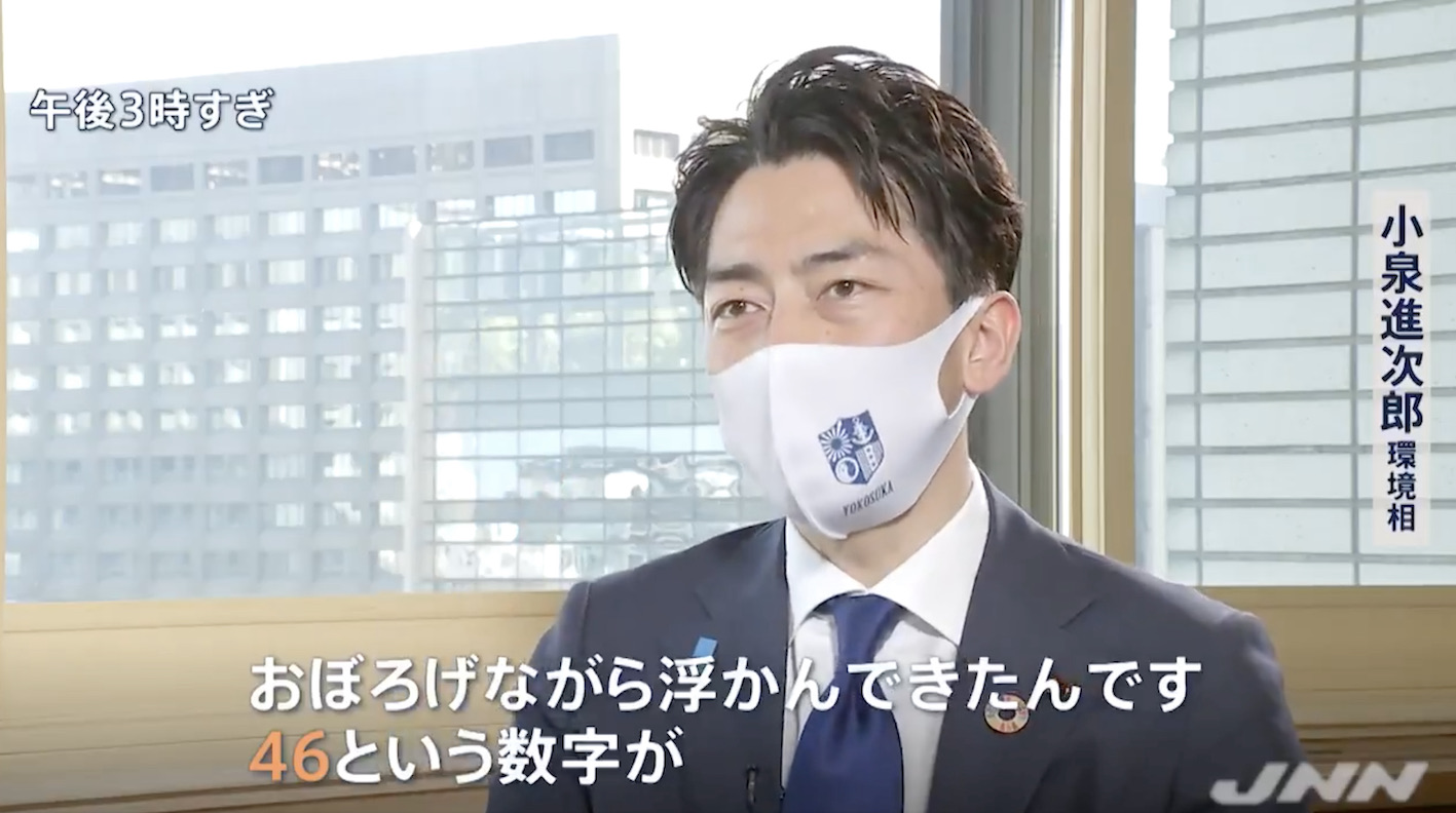 同23日放送のT B S系の『NEWS23』で小泉大臣がインタビューに応じた。「46%に設定した根拠」について、小泉大臣は両手で“浮かび上がる”輪郭を描きながらこう語った。