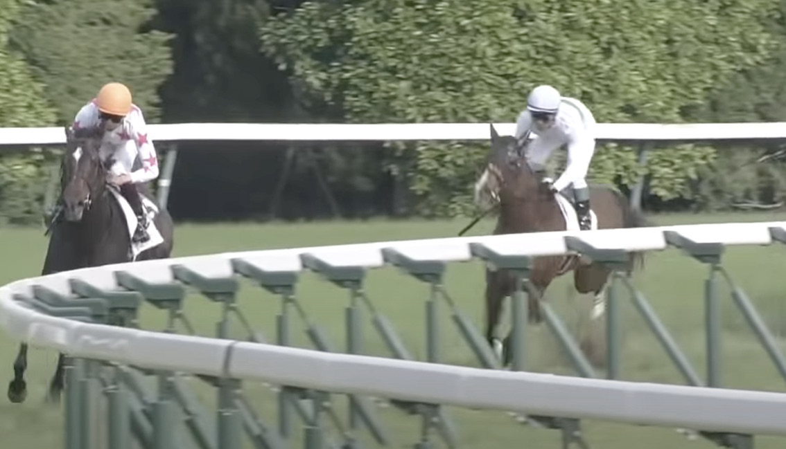東京優駿で2番手を進むロジャーバローズ(右、JRA公式チャンネルから)