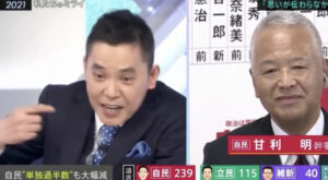 話が始まる前に、同氏の神奈川13区の情勢を小川彩佳アナが紹介。出口予測では甘利氏が48%で、立憲民主党の太(ふとり)栄志氏(51%)にリードされている情勢を伝えた。甘利氏苦戦の状況で、太田氏とのやりとりが始まる。