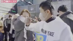 ウクライナ人と思われる女性とヒジでタッチする辻元氏(右、清美チャンネルから)