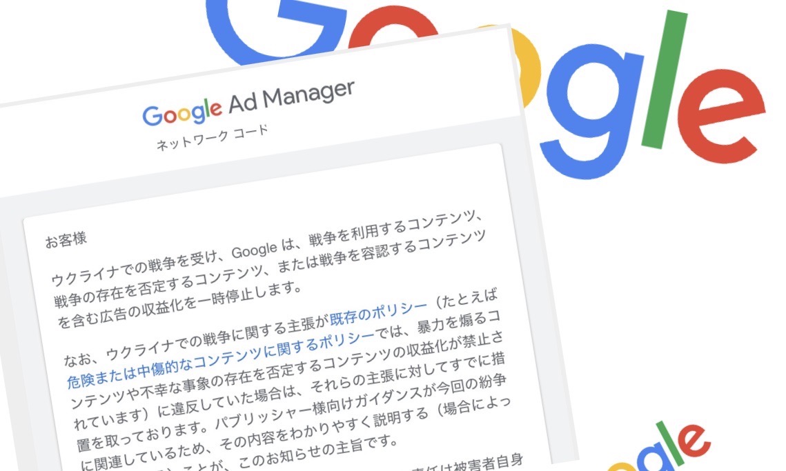 ウクライナ侵攻に関するコンテンツへの広告配信事業について、Googleが警告を発した。戦争の存在を否定したり、戦争を利用したりするコンテンツに対して広告収益を停止するというもの。当サイトを含む広告配信を受けているサイトへ警告が発せられたものと思われる。参議院議員の鈴木宗男氏、弁護士の橋下徹氏らの主張も収益停止の対象とされる可能性はある。