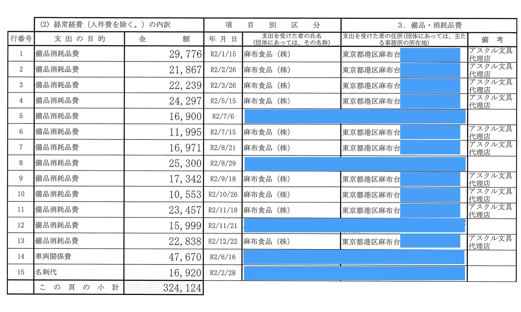 「アスクル文具」という表記は報告書の年によって微妙に異なるが、ほぼ同一である。文具に3年で70万円支出するのは一般人には理解し難い部分はある。コピー使用料、コピーリース料は別途支出、また、消耗品費、備品消耗品費という名目でビッグカメラ、イオンマーケット、ヨドバシカメラなども支出を受けており、麻布食品への支出はそれ以外の備品・消耗品のためと思われる。
