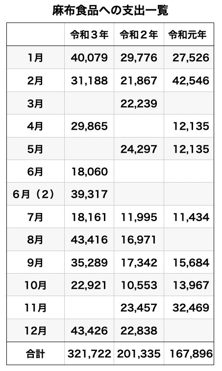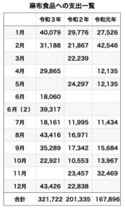 2021年の政治資金収支報告書には麻布食品(株)に対する支出が10項目あり、合計で32万1722円となっている。同様に見ていくと、2020年(令和2)は20万1335円、2019年(令和元)16万7896円で、遡れる3年間で小西ひろゆき後援会から合計69万953円が麻布食品に支払われている。一覧表にしたのでご覧になっていただきたいが、1か月の支出は最大でも4万3000円余で、5万円を超えていない。この事実は後々、意味を持ってくるので頭の片隅に留めておいていただきたい。