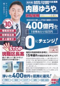 今年の区長選で配布された内藤氏のビラには、「400億円を0(ゼロ)にチェンジ!」と大きく書かれている。