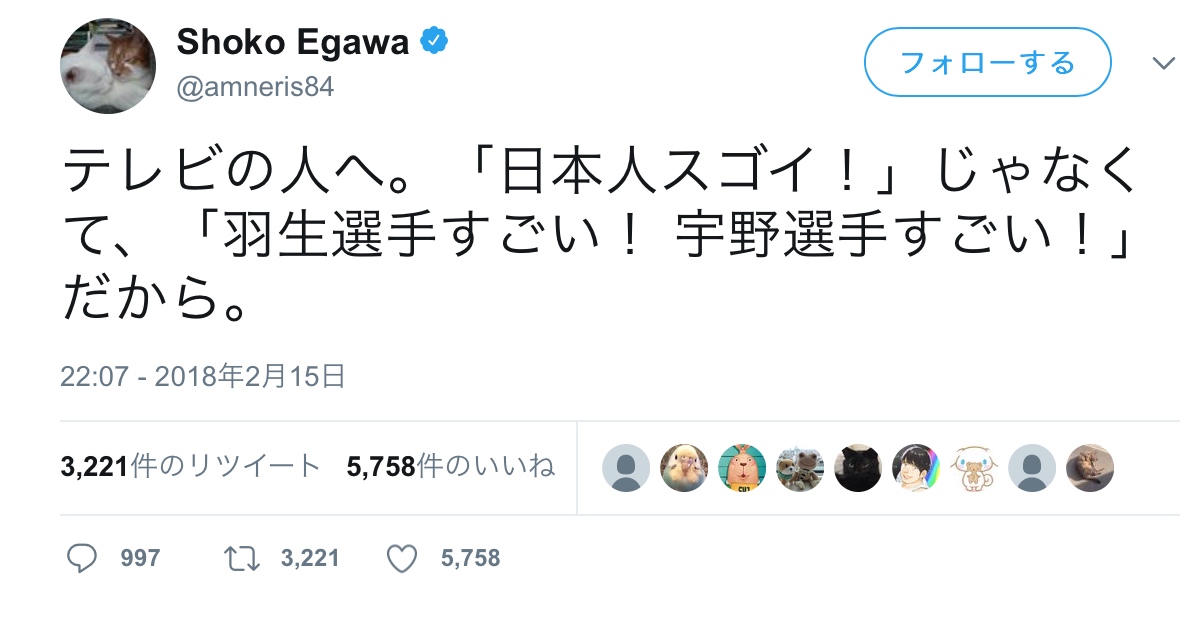 江川紹子氏は羽生結弦選手の金メダル、宇野昌磨選手の銀メダル獲得後の2月16 日に「テレビの人へ。『日本人スゴイ!』じゃなくて、『羽生選手すごい!宇野選手すごい!』だから。」とつぶやいた。