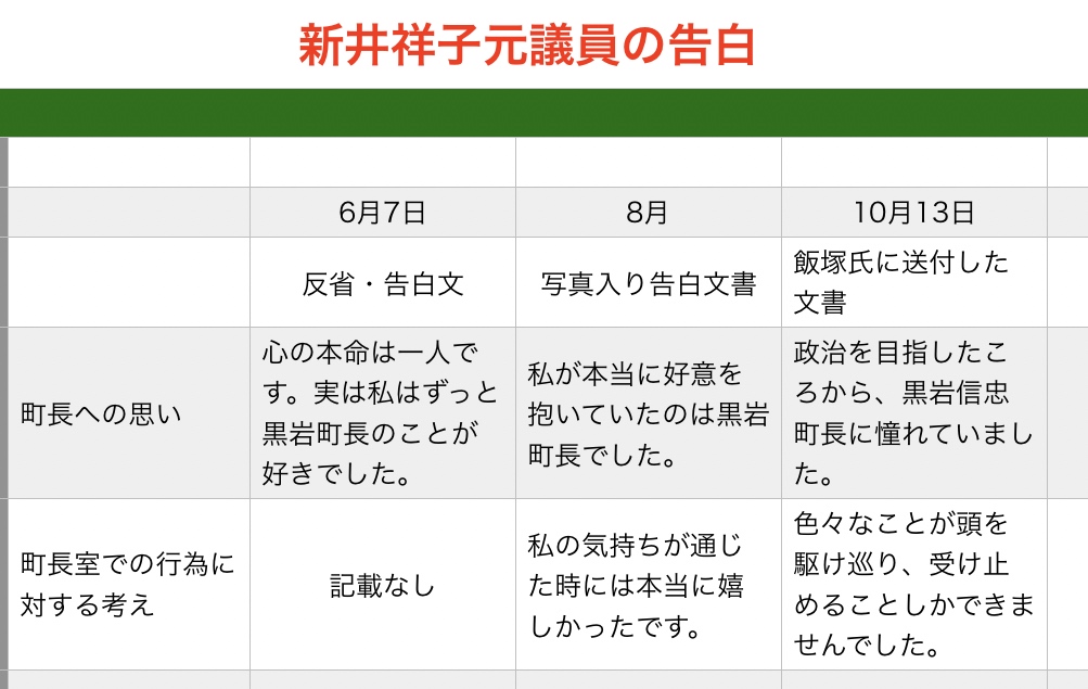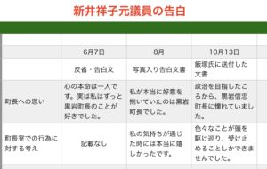 当該書籍によると、新井祥子元議員は反町長派のG議員の応援を得て初当選した。そのため、G議員から町長の悪口を書くこと、会話を録音するように言われ、その通りにしていたという。しかし、近づくうちに町長に好意を持ってしまったらしい。そのあたりは2019年6月に彼女が書いた文書①で好意を持っていることが明かされている。また、8月に書いた文書②がそのまま当該書籍に掲載されているので、以下に引用する。