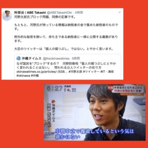 河野大臣は沖縄タイムスの阿部岳記者をツイッターでブロックしているそうで、会見では「誹謗(ひぼう)中傷うんぬんはブロックしている」、「個人が暇つぶしでやっているものにとやかく言われることはない」と述べた。この言葉で今回の問題は全て終了である。