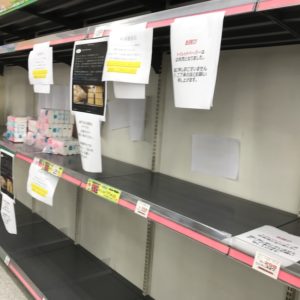 3店舗ともトイレットペーパーの棚には空きがあり、まだ完全には供給されていない状況であろう。しかし、全くない東京に比べると買えるだけ幸せ。店員さんに「東京では全くありませんよ」と言うと、「え、そうなんですか!?」と驚いていた。