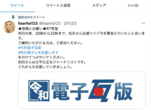 今回、ツイデモを実行したlisanha123さんは「#令和電子瓦版」「#松田隆さんを応援します」の2つのハッシュタグを作り、Twitter上で呼びかけた。