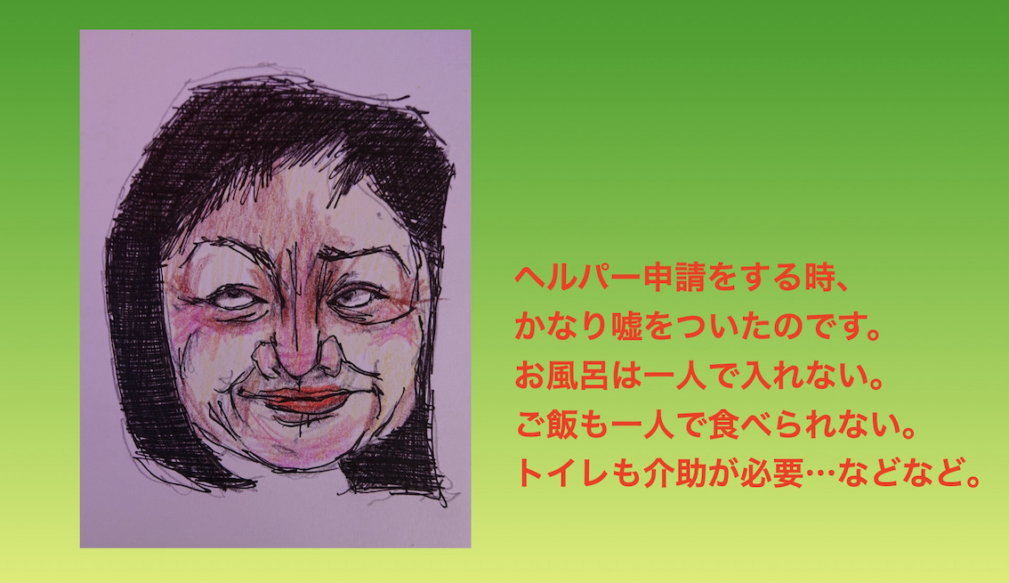 ”区役所と話し合い、「旦那がほとんど家にいない」ことを認めてもらい、「例外」としてヘルパーを利用できるようになっている。”との記載がありました。
