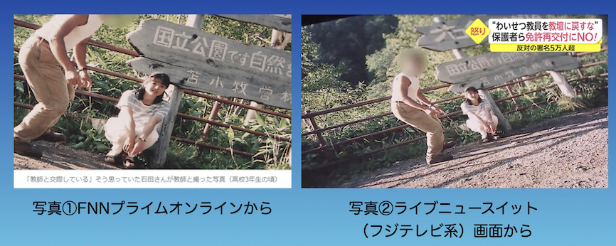 ライブニュースイット(フジテレビ系)は2020年9月30日、写真家の石田郁子氏が中学・高校時代に札幌市の教師・鈴木浩氏(仮名)にわいせつな行為を受けていたという訴えについて、石田氏の言い分をそのまま報じた。