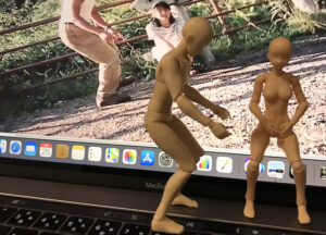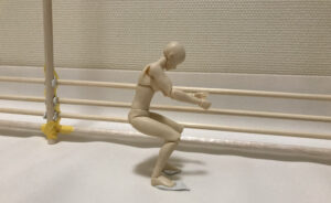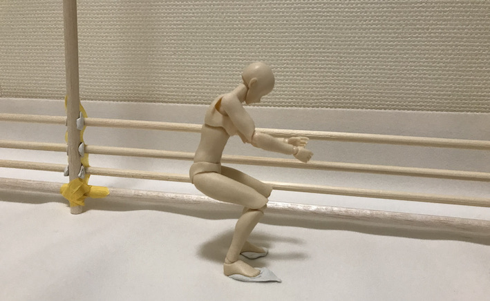 柵の横棒(ビーム)は写真と同じ4本にし、一番上が人物の胸のあたりに来るようにした。写真では背中が日光に照らされており、そのようにして撮影したのが写真④である。