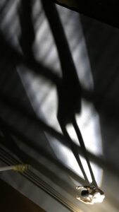 太陽の位置が低くなると必然的に影は長く伸びるため、相対的に細く見えるのである。その結果、足の影と柵の支柱の影と見分けがつきにくくなる。