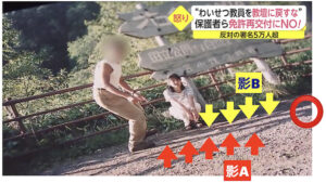 写真②に印をつけたのが写真②-2である。赤い矢印の先にある「影A」は柵の支柱の影かもしれず、鈴木氏の体を透過しているようにも見える。そのことから鈴木氏の影がなく、写真に鈴木氏の姿を合成したのではないかという疑問の声がツイッターを中心に広がった。