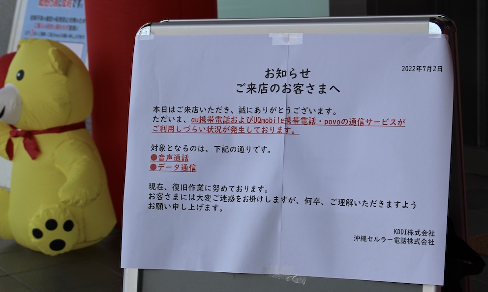 散髪の後でauショップを2店舗訪れたが、どちらも入口に大規模通信障害の状況が張り紙でお知らせされていた。店員に聞くと「復旧のメドは立っておりません。誠に申し訳ございません」と、マニュアル通りなのか同じ説明と謝罪をするのみであった。