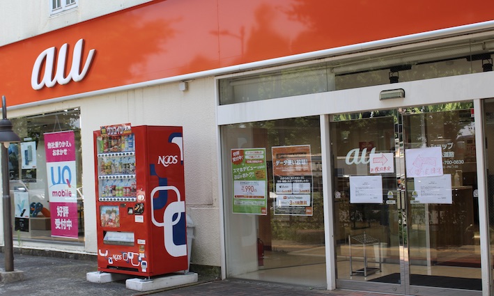 auショップの入口には通信障害のお知らせが貼られている(撮影・松田隆)