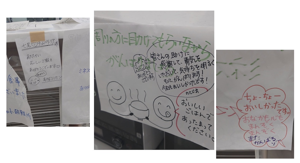 避難所では、配送するメンバーに被災者からの感謝の言葉、メッセージが目に付く場所に貼られている。「ちょーちょーおいしかったです。おなかも心もまんぞく まんぞく またがんばるゾー」「皆さんの助けに感謝して、勇気をいただいて、気持ちを明るくもって、がんばります! 今日もおいしかったです!」