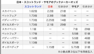 もっとも、サモアがからむと、それなりにブックメーカーも日本をリスペクトしてくれているのが分かる。スコットランドーサモアはスコットランド勝利のオッズは1.1倍~1.17倍。1万円賭け、的中しても1万1700円しか戻ってこない。逆にサモアの勝利は5.5倍~7倍と日本の2倍を切るオッズより遥かに高く設定されている。