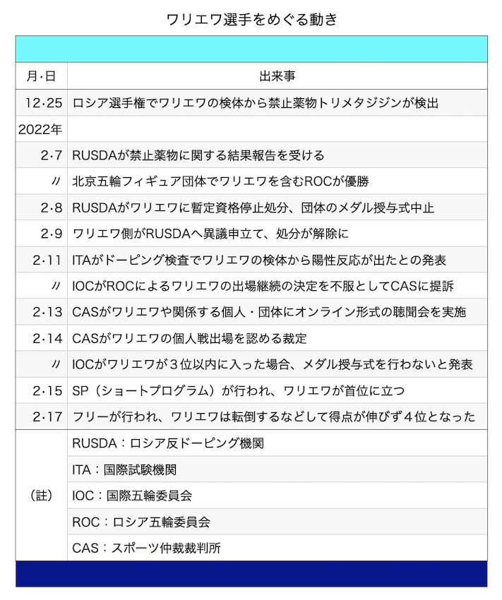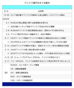 一連の動きを時系列でまとめたが、通常であれば、ROC(ロシア五輪委員会)が資格停止処分にして出場させないのであろうが、ワリエワ選手側の異議申立てを受けて1日で解除してしまった。