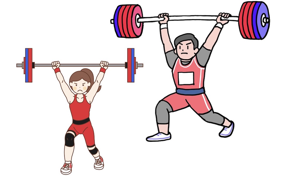 ウエイトリフティングで男女ともに存在する69kg級の階級の合計重量の世界記録で比較すると、男子359kgに対して、女子は286kgで、男女の重量比は100:79.7となる。