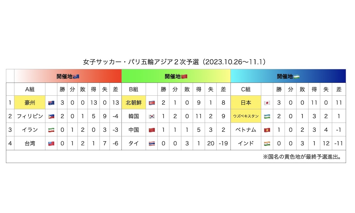 こうして日本vsウズベキスタンは2-0で試合が終了、逆に豪州はA組2位の可能性があったフィリピンに大差をつけて2位での最終予選進出を防ごうと考えたのであろう8-0と容赦のない試合で圧勝した。この結果、最終的にA組フィリピンは2位で得失点差-4、C組2位ウズベキスタンは得失点差+1で、ウズベキスタンが最終予選へ駒を進めたのである(B組2位は韓国で1勝2分の勝ち点5で最終予選進出ならず)。ちなみにウズベキスタンの監督は本田美登里氏であった。