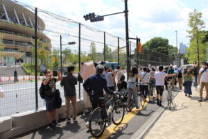 東京五輪が1年遅れで開幕した。最高気温34度まで上昇した都心部だが、猛暑の時間帯にもかかわらず国立競技場の周辺には多くの人が集まっていた。競技場の周辺はバリケードが設けられ、一般の人は近づけないようになっているがバリケード越しにスマートフォンで競技場を撮影する人が見受けられた。